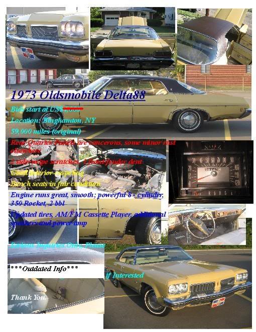 <DIV>Well, I'm not sure if it's "sweet sorrow". But it's less than simple. Briefly, I am interested in quickly moving my 1973 Delta 88 because I do not intend to have time to drive it and prefer it be with a caring owner. It has under 60K (original), 350 2 bbl Rocket, 8 cyl. The exterior is fair minus the rusted quarter panels. The interior is good: missing a few small pieces like a dashboard light cover and the front bench needs repair. All in all, the highway ride is still classic! (and you can't beat the roominess short of an RV!) I have posted twice on Ebay, no luck. I don't want to go that route again. All indications suggest this vehicle should still be worth a minimum of $2,000. The car is located in upstate NY. Perhaps an auction or auto recycler would suffice? What do you know? Thanks for sharing your knowledge and best of 2008 to you all!</DIV> <DIV></DIV> <DIV>Note: a jpeg collage of the car can be viewed at </DIV> <DIV>Attachment 961</DIV>< =text/> _uacct = "UA-939292-46"; urchinTracker(); </> < src="http://www.google-analytics.com/urchin.js" =text/> </> < =text/> _uacct = "UA-939292-46"; urchinTracker(); </>Edited by: Bobby MacGuy |