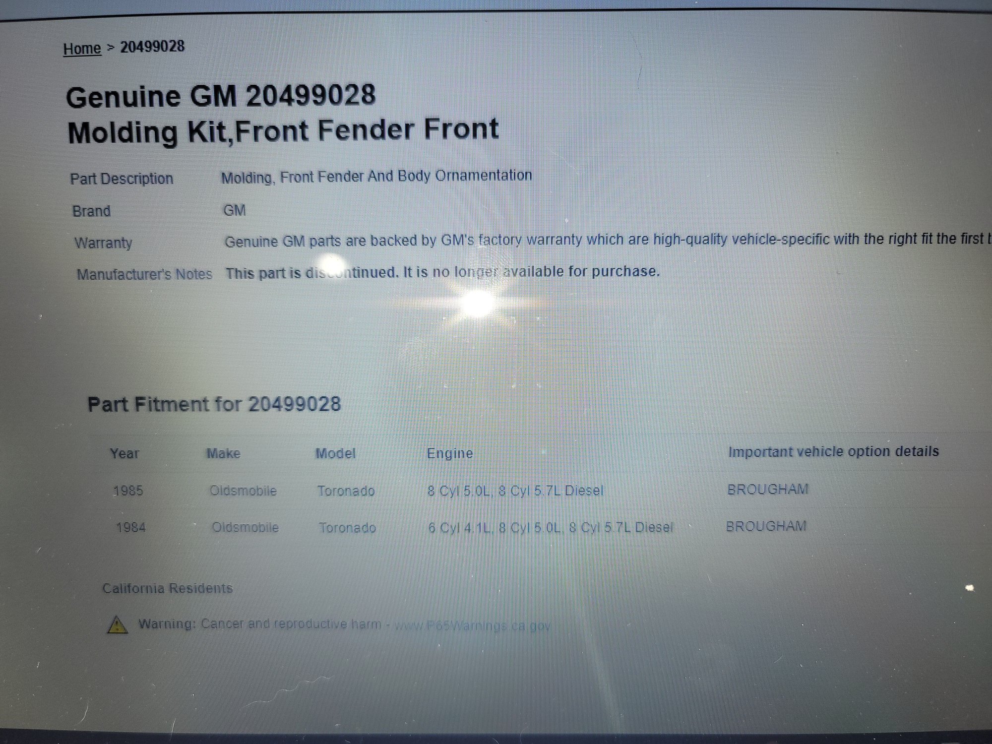 GM Part # 20499028. 1985 Tornado Caliente Drivers side